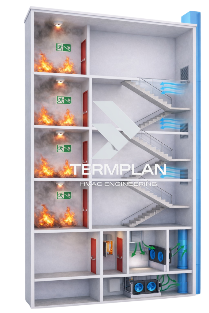 Desenvolvemos projetos e executamos a instalação de sistemas de pressurização de escadas de emergência, com soluções técnicas dimensionadas para garantir a integridade das rotas de fuga.